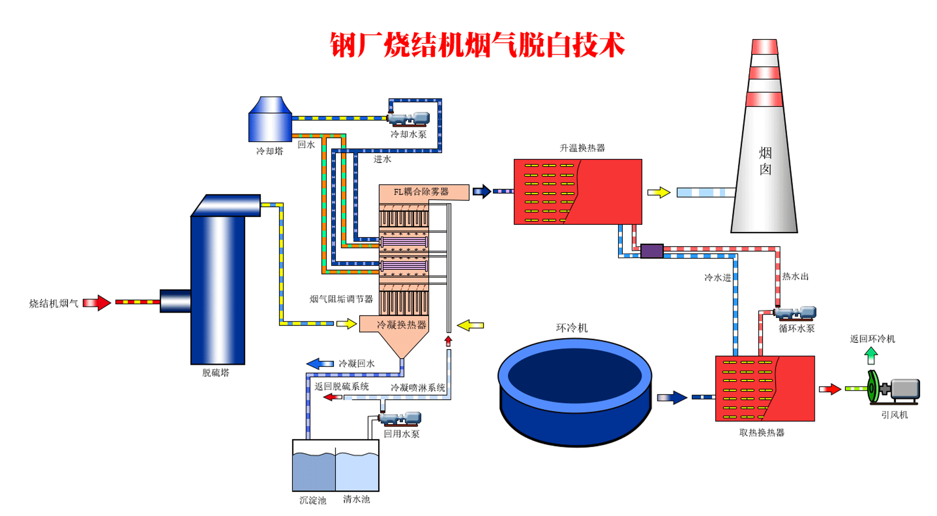 此种对烟气进行冷凝+再加热方案,主要是将工艺生产过程中的高温烟气的热量通过换热器吸取的热来加热冷凝后的不饱和烟气,对在饱和湿烟气在温度较低时对烟气进行冷凝,析出烟气中大部分的水分和污染物,再对冷凝后的低温烟气加热使原来的饱和烟气变成不饱和烟气,即使在大气温度温度较低条件下,也不至于在排烟时产生结露现象,同时能够提高原系统节约用水、用电、提高原系统的稳定、高效运行,降低能耗。